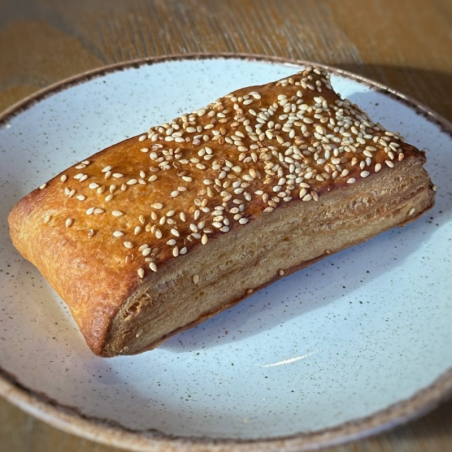 Un produs cu aer mediteranean, pregatit din aluat de foitaj pufos, copt pana devine auriu si fraged. Umplutura e un mix savuros de masline negre, rosii uscate si ulei de masline, completat de note subtile de ierburi aromatice. Gustul bogat si textura usor crocanta fac din aceasta pernita o alegere ideala pentru cei care prefera o varianta vegetala sau tin post, dar nu vor sa renunte la placerea unui produs de patiserie bine facut. E perfecta pentru o gustare rapida in timpul zilei sau pentru un pranz usor, alaturi de un ceai sau o cafea simpla.